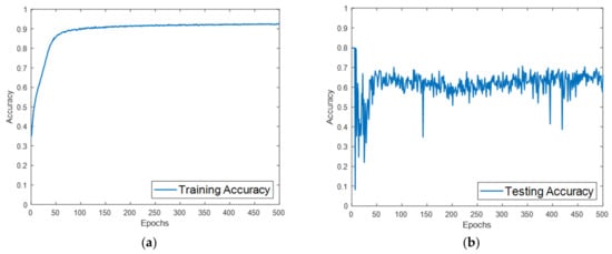 The performance of ResNet was then evaluated on the original database (Figure 4). The results show that highly complex datasets with a comparably low amount of data can be a significant penalty when training a neural network. In epoch 461, the training accuracy increased to 92.63%, whereas the testing accuracy reached 70.75% in epoch 241. Here, the meaning of testing accuracy is simply how much data were predicted to be the same as the true label. For a more detailed analysis of the testing accuracy, the average accuracy after epoch 100 was 62.17%, with a standard deviation of 4.13%. This means that training ResNet with the original database can result in a network performance of 62.17% ± 4.13%.
