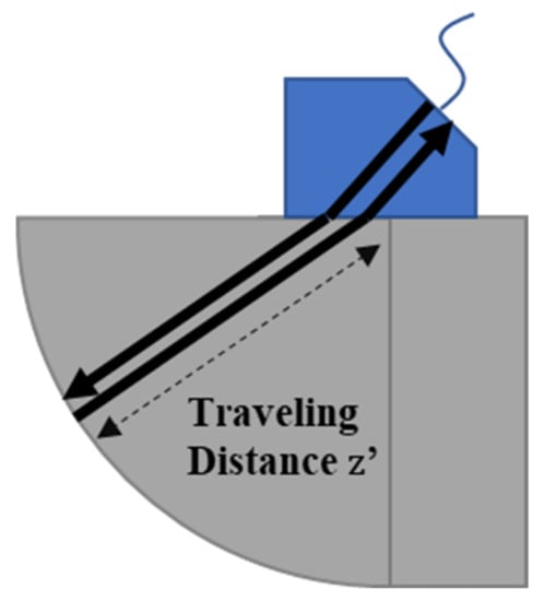The reflection is affected only by the mechanical property of the two mediums and the incidence angle. Here, the round surface of the reference block fixes the incidence angle as normal when the transducer angle varies. Therefore, is constant, while i represents each transducer with a different angle. Furthermore, the reflection coefficient for steel to air is significantly close to −1 in this case. This means that Equation (9) is described as Equation (10):