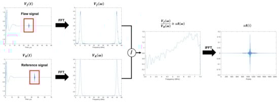 where is diffraction correction in the reference specimen and is the reflection coefficient from the round surface. In the frequency domain, the signals and can be combined by simple multiplication, not convolution [34,35]. Using fast Fourier transforms (FFT), and are described in the frequency domain as Equations (7) and (8):