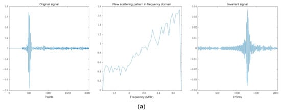To reduce complexity, the system invariant method should be used to reconstruct the ultrasonic weldment signals in the original database. Examples of crack signals before and after using the system invariant method are shown in Figure 8. The system factor was removed from the original signals, leaving only the scattering pattern from flaws. The database that uses the system invariant method is referred to as the invariant database.
