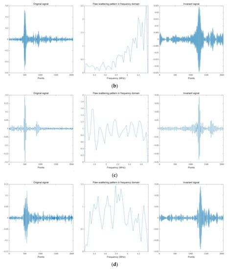 Examples of cracks and porosity signals when applying system invariant method, from left to right: original signal, flaw scattering pattern in the frequency domain, and invariant signal; (a) crack signal with Olympus A430S (45 degrees, 2 MHz); (b) crack signal with KrautKramer WB70-4 (70 degrees, 4 MHz); (c) porosity signal with Olympus A430S (45 degrees, 2 MHz); (d) porosity signal with KrautKramer WB70-4 (70 degrees, 4 MHz).