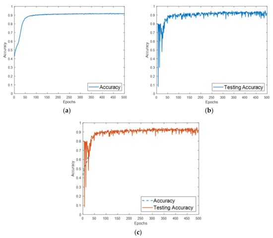 The performance of ResNet was then evaluated on the invariant database, as shown in Figure 9. The results show that the system invariant method can reduce database complexity and enhance network performance. The training accuracy increased to 92.15% in epoch 446, which is comparable to the original database, whereas the testing accuracy was higher than 95.04% in epoch 491. For a more detailed analysis of the testing accuracy, the average accuracy after epoch 100 was 91.45%, with a standard deviation is 1.77%. This means that training ResNet with the invariant database can obtain a network performance of 91.45% ± 1.77%.