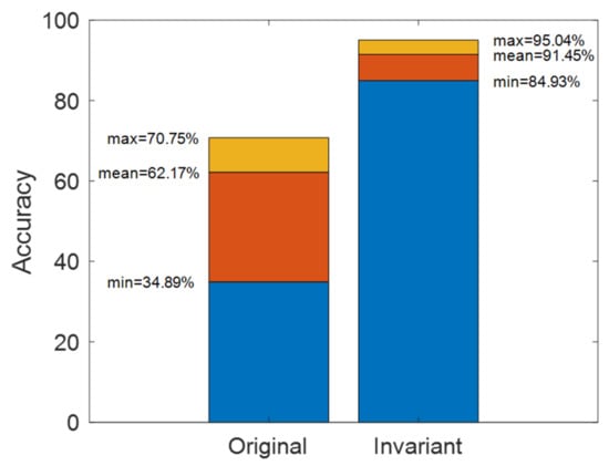 Table 7 and Figure 10 show a performance comparison. Comparing the training accuracies, the invariant database featured lower average accuracy, but a smaller standard deviation than the original database, making it difficult to determine which is better. It is more rational to consider this as an error that can occur naturally during the training process of a neural network, rather than a performance deviation.