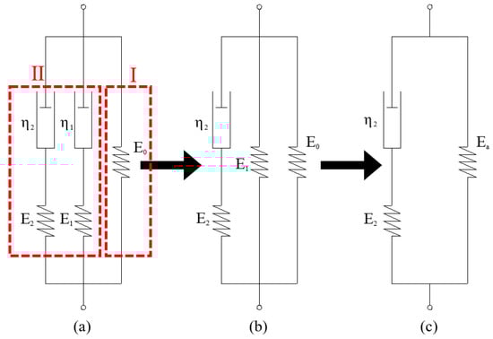 The main expression of the Z-W-T non-linear viscoelastic model (Equation (1)), which is shown in Figure 1a, consists of two parts [28]: one is the transient response element, which is unrelated to the strain rate (E0 in Figure 1a, part I in Equation (1)), and the other is the transient response, which is related to the strain rate and is composed of two Maxwell elements (E1 and E2 in Figure 1a, part II in Equation (1)).