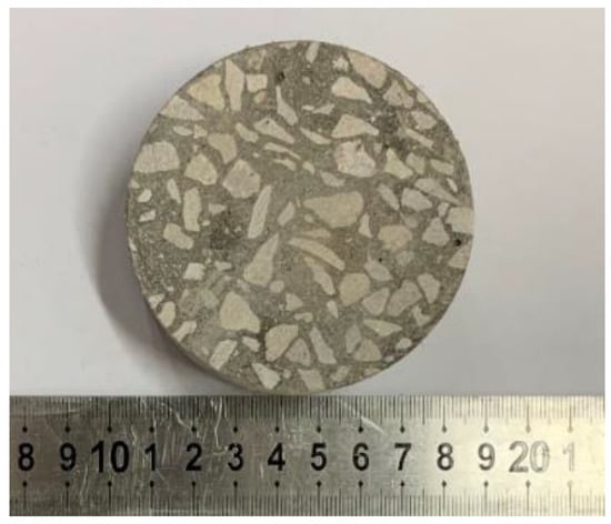 For these experiments, Chinese national standard P.O.42.5 Portland cement produced by Yunnan Hongshi cement Co., LTD was adopted. High-quality grade II fly ash with a density of 2098 kg/m3 was produced by Yunnan Power Plant from Yunnan Province was used for the experiments. The following water–binder ratio was adopted for all mixes: 0.44. The characteristics of the polypropylene fibers used in this experimental are shown in Table 1. The proportions of the concrete samples are described in Table 2. The polypropylene fiber concrete specimens were made into φ75 mm × 40 mm cylinder specimens [48], as shown in Figure 2.