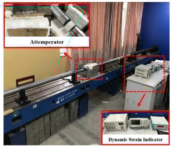 In the real-time high-temperature SHPB experiment, the SHPB equipment was modified, and the insulation device was installed in the same position as the loading specimen. The strain gauges were positioned 1.8 m and 0.6 m away from the contact of the specimen at the incident rod and transmission rod, respectively.