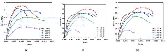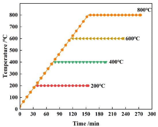 During the heating process, the heating rate was set to 5 °C/min, which was chosen based on the heating method used for concrete specimens in the literature [43], and the constant temperature was maintained for 2 h when the temperature reached the set temperature grade. The heating curves are shown in Figure 4.