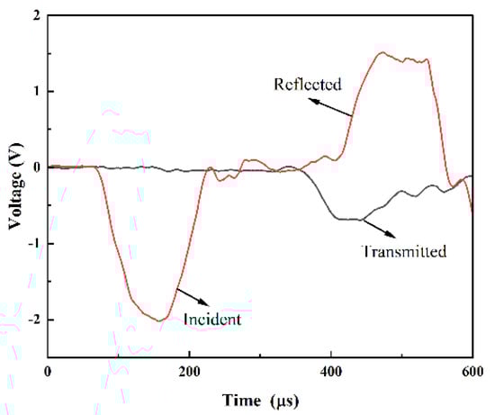 The representative original voltage signal diagram for this experiment can be seen in Figure 6. It can be observed from Figure 6 that the loading waveforms show a semi-sinusoidal shape and that the curves are smooth without any obvious waveform diffusion being observed. The incident wave also basically returns to the origin, and the reflected wave has a relatively smooth section, which meets the constant strain rate loading conditions [53,55].