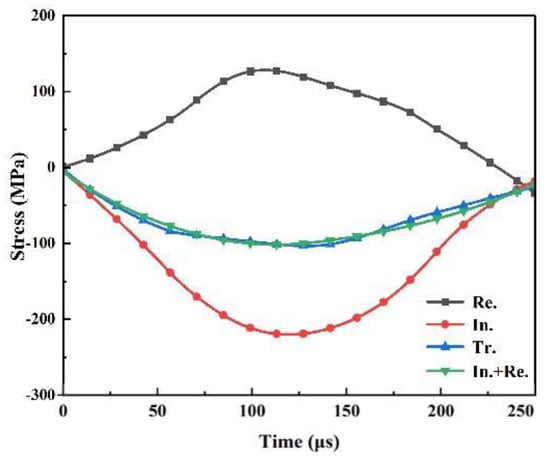 As shown in Figure 5, during the SHPB experiment, the stress wave and the marked incident wave were produced by the impact transmitting along the axial direction of the bar [53]. Some stress waves are reflected at the S1 interface and propagate in the opposite direction to form reflection waves , and the residual stress waves continue to propagate through the specimen to form transmission waves in the transmission bar. The incident waves , reflection waves , and transmission waves were collected by strain gauges A and B, which were attached to the incident rod and transmission rod, respectively.
