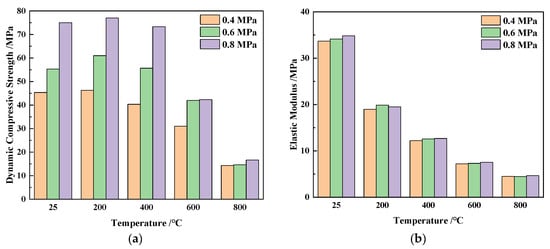 It can be observed from Figure 9a that under the action of temperature load, the dynamic compressive strength of polypropylene fiber concrete was not monotonically linear as the temperature grade increased. For example, with an impact air pressure 0.4 MPa (average impact velocity = 5.5 m/s), compared with the case at 25 °C, the dynamic compressive strength of polypropylene fiber concrete at 200 °C increases by 10.2%, and compared with the case at 200 °C, the dynamic compressive strength of polypropylene fiber concrete at 400 °C, 600 °C and 800 °C decreases by 8.73%, 31.14% and 72.59%, respectively. It seemed that there was a threshold temperature grade; when the temperature grade was lower than this threshold, the dynamic strength of polypropylene fiber concrete increased as the temperature grade increased, and when the temperature grade was higher than this threshold, the opposite situation takes place. In this experiment, the threshold was between 200 °C and 400 °C. It also can be observed from Figure 9b that the elastic modulus of polypropylene concrete under different temperature grades decreased as the thermal grade increased and that it reached its minimum at 800 °C. Although the dynamic elastic modulus showed an improvement when the impact pressure level increased, the strain rate effect of the elastic modulus is not as obvious compared to the strain rate effect of the dynamic compressive strength.