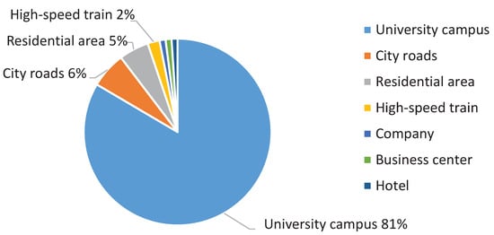 Using these three indicators, we take cellular networks deployed in Jiangsu province as examples to study the features of high traffic load cellular networks. We monitor the field data of cellular networks multiple times in several weeks, and all field data reported in this paper are average means. As statistics show in Table 2, we observe that network performance metrics of cells with high traffic loads, that is, access success rate and single user downlink speed, are significantly lower than those of all cells. Moreover, around 81% of cells with high traffic loads are located in university campuses, which is shown in Figure 2. Based on these observations, we analyze the relationships between three indicators and the network performance metrics (i.e., access success rate and single user downlink speed) in Section 2.3 and Section 2.4.