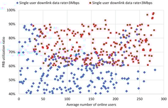 We used 3 Mbps servers as the baseline of the downlink data rate to investigate the performance of a cellular network. According to the field data reported in Figure 3, the number of users with downlink speed lower than 3 Mbps significantly increases when the average number of users and PRB utilization ratio increases. As shown in Table 5, we realize that the percentages of users with low data rates are around 73% and 88% when downlink PRB utilization ratio ranges from 70% to 100%, respectively. Intuitively, we can set up the threshold of the utilization ratio of PRB according to field data as well as the threshold of ANOU, which are discussed in Section 3, Section 4 and Section 5.