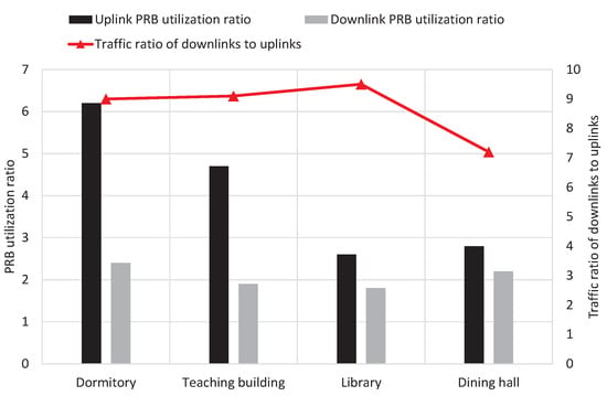 As the red line shows in Figure 5, the traffic load of downlink is much larger than that of uplink in different areas of university campuses, such as dormitories, teaching buildings, libraries, and dining halls. Moreover, the PRB utilization ratio of downlinks is much lower than that of uplinks. The reason is that different vendors offer similar proactive mechanisms to adjust the PRB ratio of uplink, which leads to imbalances between the PRB utilization ratio of uplink and the PRB utilization ratio of downlink (i.e., as shown in Figure 5, the PRB utilization ratio of uplink is significantly larger than that of the downlink in low traffic scenarios).