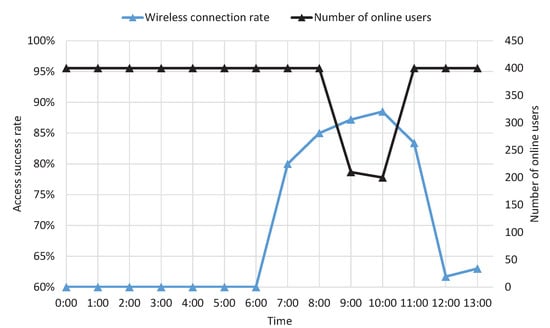 As shown in Figure 6, we represent the traffic feature from campuses covered by ZTE devices. We observe that when the number of online users is larger 250, the wireless connection rate success rate is significantly deteriorated. Meanwhile, the practical cell capacity is much lower than nominal capacity. After studying the configurations related with SR and CQI, ‘SRTrCHNum’ and ‘CQIRpTTINum’ are two key parameters directly related with network performance. ‘SRTrCHNum’ and ‘CQIRpTTINum’ represent the number of allocated channels corresponding to the SR period of user equipment (UE) and the number of time division subframes in the shortest CQI periods. After reconfiguring ‘SRTrCHNum’ and ‘CQIRpTTINum’, the capacity of the corresponding cell can support 400 online users. In addition, we can give the first priority of user access using Huawei’s device, which can increase the number of online users to achieve the maximum device capacity.