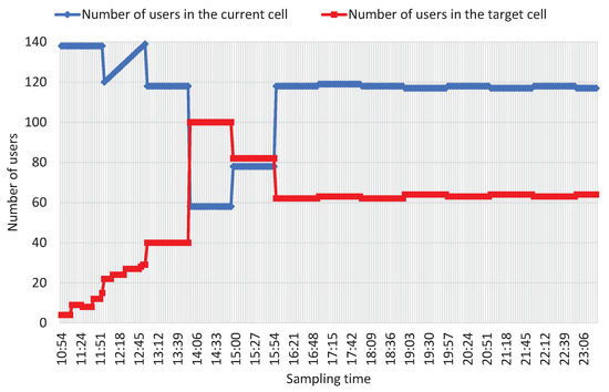 ‘ThreshXHigh’ and ‘ThreshXLow’ represent the thresholds of UE to reselect a frequency whose priority is higher and lower than the current frequency, respectively. ‘ThreshServLow’ is used for UE to reselect dissimilar frequency cells with low priority. It is obvious that the proper configuration of a dual-band network with D and F frequency bands can effectively mitigate the imbalance of busy and idle duration of cells. However, it is possible that the density of users becomes high in a single cell with and frequency bands (or and frequency bands). Mobile load balancing (MLB) can enable the imbalance traffic load in dual-band networks. In Figure 7, we report the trends of the number of online users when enabling MLB in cells equipped by Huawei devices.
