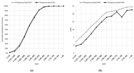 Cellular network performance with different frequency band policies. (a) CDF vs. RSRP. (b) SINR vs. RSRP.