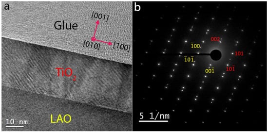 (a) Cross-sectional TEM image of the TiO2/LAO interface. (b) The SAED patterns at the TiO2/LAO interface correspond to [010] zone-axis.