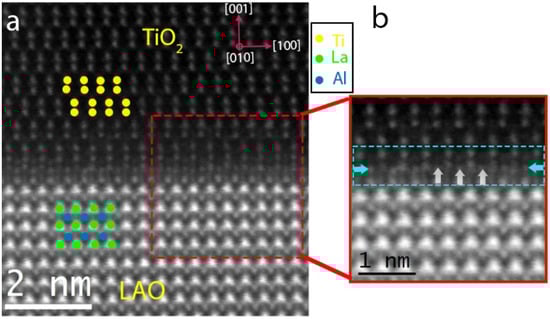 To gain more insight into the atomic structure of the TiO2/LAO interface, we performed advanced STEM-HAADF experiments with a Cs-corrected microscope, since HAADF provides the atomic sites of heavy elements, which enable us to visualize oxide interfaces [29,30,31]. A representative STEM-HAADF image of the TiO2/LAO heterostructure is shown in Figure 2a. The predominant signal in the film comes from the typical dumbbell structure of TiO2 anatase, while the signal of the substrate is dominated by the heaviest La ions (labels are superimposed to the image for ease of visualization). In Figure 2b, an enlarged view of the interface region is provided and marked with a cyan-colored dashed box. The atomic stacking in the vicinity of the interface is strikingly different from both the substrate and the film. This can be better appreciated from the magnified image of Figure 2b, where extra atoms (marked with white arrows) can be identified with a relative distance of half of the unit cell of anatase along the [100] direction.