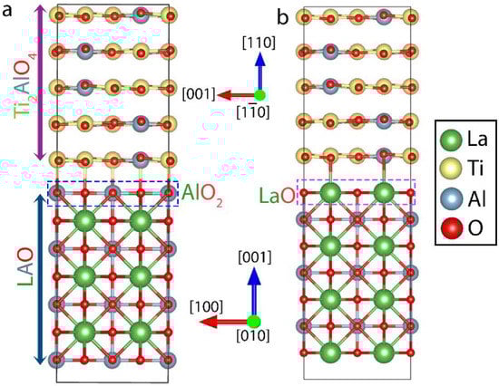 At first, to identify the interfacial termination of LAO substrate, the bulk unit cells of LAO and Ti2AlO4 were relaxed using DFT as implemented in the Quantum Espresso software suite [24]. With the optimized coordinates, surface slabs were built along [001] and [110] for LAO and Ti2AlO4, respectively. The lattice parameters for the (2 × 2) LAO [001] surface slab were optimized to be a = b = 7.55 Å and those for (1 × 1) Ti2AlO4 (110) were optimized to be a = 8.13 Å and b = 8.31 Å. For building the surface slab, surface energy convergence was tested against the surface slab thickness to ensure bulk-like behavior for the substrate. To mimic the atomic stacking of the experimental image of Figure 2b, at first, a two-layer surface slabs were built by seven layers (2 × 2) LAO (001) and five layers of (1 × 1) Ti2AlO4 (110) with two types of LAO surface terminations: AlO2 and LaO termination. For building this heterostructure, (1 × 1) Ti2AlO4 (110) was strained to twice the substrate lattice parameter of a = b = 7.55 Å. In Figure 3, two types of substrate termination models for the unrelaxed configurations are shown for Ti2AlO4 (110) on LAO (001). Among these two models, the most favorable termination is found to be AlO2 by calculating the interface formation energy [32], although the formation energies of the two types of terminations are almost identical. By visual cues from the HAADF contrast of Figure 2b, it was confirmed that the termination is indeed AlO2 termination.