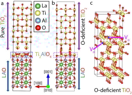 Based on these optimized bilayer models, a tri-layer supercell was then created to match experimental observation (Figure 4) by stitching pure anatase (without oxygen vacancies) TiO2 and O-deficient anatase TiO2 to one monolayer of (1 × 1) Ti2AlO4 (110) on AlO2-terminated LAO (stackings are described from the top of Figure 4). The model configurations were built along the [001] direction with seven atomic layers of LAO, one monolayer of Ti2AlO4, and nine layers of anatase TiO2. These layer thicknesses were sufficient to represent the bulklike properties. The DFT-relaxed interfaces of Ti2AlO4/pure-TiO2 and Ti2AlO4/O-deficient-TiO2 are shown in Figure 4a,b, respectively. The red arrows in Figure 4a,b show the force vectors due to DFT relaxation. The positions of random oxygen vacancies within the O-deficient TiO2 structure are shown with magenta arrows in Figure 4c. By comparing Figure 4a,b, it is observed that the creation of the O-vacancy affects the interface rearrangement differently. The different directions of force vectors acting at the alloy layer give rise to different equilibrium distances in the interface region. The equilibrium interface layer spacings between extra-layer Ti2AlO4 and TiO2 are 3.1 Å and 2.1 Å for the configurations in Figure 4a,b, respectively. To check the structural stability of such a heterostructure, we further calculated the interface adhesion energy [32], which confirms that the heterostructure model of Figure 4b is dynamically more stable than the pure anatase model (Figure 4a). In addition, the force acting on atoms (red arrows) presented in Figure 4b shows that the region near the interface (marked with the magenta-colored dashed box) favors bonding with O-deficient TiO2.