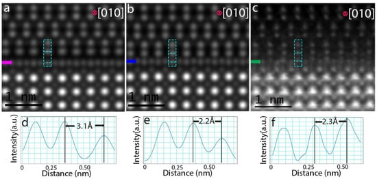 In order to compare the interface models with the experimental evidences, STEM-HAADF simulations were performed for both these (Figure 4) geometry-optimized structures using QSTEM software [26]. The optimized coordinates were repeated along the electron-beam direction to create a model thickness of 19 nm, consistent with previously calculated model thickness [17]. The simulated STEM-HAADF images of AlO2-terminated LaAlO3/Ti2AlO4/pure-TiO2 and LaAlO3/Ti2AlO4/O-deficient-TiO2 are shown in Figure 5a,b, respectively. The interfacial extra layer, Ti2AlO4 is marked with arrows in Figure 5. The measured spacings between the extra Ti2AlO4 layer and TiO2 film (marked with cyan-colored dotted box in Figure 5a–c) are 3.1 Å (Figure 5d), 2.2 Å (Figure 5e) and 2.3 Å (Figure 5f), for Figure 5a–c, respectively. This indicates that the LaAlO3/Ti2AlO4/O-deficient-TiO2 model is in a very good agreement with the experimental image presented in Figure 5c. Our results provide strong evidence that the oxygen vacancies in TiO2 play a crucial role in stabilizing the alloy Ti2AlO4 layer at the interface between film and substrate.