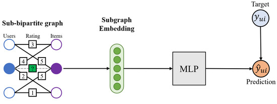 As shown in Figure 1, the existing IGMC model [6] transforms a rating matrix of the user–item into a bipartite graph and uses the MLP to predict the unobserved interaction between the user and the item using subgraph embedding. IGMC learns the patterns of subgraphs, not the entire graph, and the model is inductive, so it can predict the rating even if some unlearned data are entered. The components of the model are largely composed of four steps.