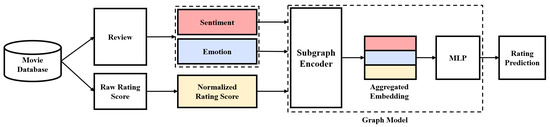 Recently, the recommendation method, which constructs the interaction between user and movie in a graph and reflects metadata and relations through the graph-natural-network (GNN), has become popular [5,6,7,8]. In this paper, we propose a new graph-based movie recommender system with BERT, which utilizes all of the rating, sentiment, and emotion information by considering the differences of the information in different dimensions. Inductive Graph-based Matrix Completion (IGMC) [6] is a link prediction method that transforms the rating matrix of user–item into a bipartite graph and predicts missing rating using subgraph embeddings. It is worth noting that the proposed model obtains user’s psychological context using fine-tuned BERT for sentiment and emotion, and predicts final ratings using IGMC by combining BERT results and rating information into a subgraph. Using Rotten Tomato movie data (https://www.rottentomatoes.com/, data accessed 13 September 2021) and Amazon review data (http://jmcauley.ucsd.edu/data/amazon/, data accessed 20 September 2021) [9,10], our experiment was conducted with baselines widely used in existing recommender systems. Throughout the experiment, we observed that CX information and IGMC-based models outperformed the baselines.