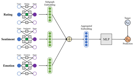 Equation (1) shows the MSE loss function that performs training process by reducing the difference between the predicted and actual ratings. Meanwhile, Equation (2) shows ARR loss function that trains adjacent ratings. The closer the rating scores are, the more similar the weights such as and are. indicates regulating matrices in a Frobenius norm. Equation (3) is the loss used when using only the rating in the IGMC method. However, because our model has three types of data, we need to define a new type of loss to reflect the characteristics of the IGMC model. As the sentiment is an ordinal data, Equation (4) is finally defined for our model applying the ARR loss functions on two data types such as ratings and sentiments. Here, because the emotion is a categorical type, it is not considered. Compared to the use of existing IGMC loss, the performance was slightly increased, but there was no significant effect.