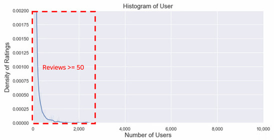 Amazon Review dataset We used Amazon product data, a popular benchmark dataset [30,31,32,33] containing product reviews and metadata of Amazon from 1996 to 2018. It also includes various categories such as Books, Electronics, Movies and TV, and Beauty. Among the categories, we used Movies and TV data, given the purpose of our experiment. First, we used the smaller version of the dataset (about 1,697,533 reviews) and chose users with more than 50 reviews to exclude the cold-start problem. Figure 5 shows the form of a long-tail graph as in Rotten Tomatoes. Second, train and test data were divided at a ratio of 8:2 according to the timestamp. Finally, 3264 user_ids and 14,124 movie_ids were used. Because the Amazon product data does not provide meta information of movies, the GCMC model does not use node features in the Amazon product data.