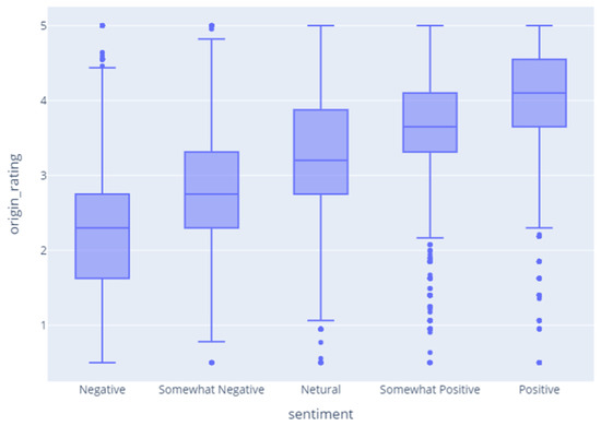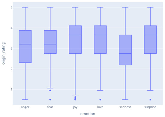 Meanwhile, Figure 7 shows the correlation between the emotion and rating, and shows that there is no clear correlation. By observing the dataset, we found that, when users felt the emotion of ‘joy, love, surprise’, they left high ratings, and when they felt the emotion of ‘sadness’, they tended to leave low ratings. On the other hand, when they felt the emotion of ‘fear’, they often left relatively high ratings.