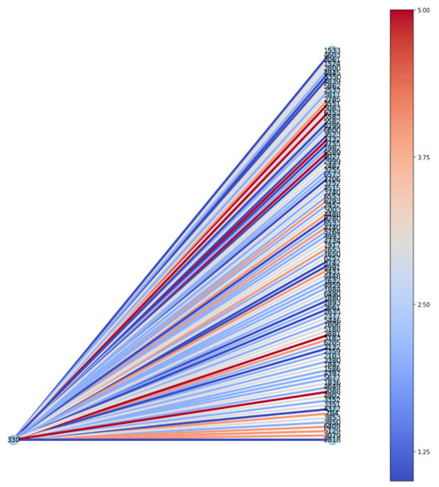 Inspired by [6], we visualized subgraphs of testing data with the highest and lowest predicted ratings for Rotten Tomatoes, as shown in Figure 8 and Figure 9, respectively. As IGMC produces distinct subgraph patterns for each rating, it is helpful to look at those patterns for further investigation closely. In each subgraph, nodes on the left are users, and nodes on the right are 100 neighbor items that the model referred to produce the predicted rating for the target item. In Figure 8, the model produced a low score (i.e., 0.73) for the target item, and the items the model referred to tended to have relatively lower ratings, colored in blue. On the other hand, Figure 9 visualized a case where the higher the predicted score was (i.e., 4.68), the higher the actual ratings of the neighboring nodes were, colored in red.