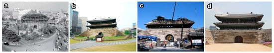 For the subsequent 500 years or so, the original form of the gate was well maintained; however, in the early 1900s, the expansion of roads and the operation of streetcars led to the demolition of the left and right walls of the gate. During the Korean War in 1950, the stone block foundation and gatehouse were heavily damaged due to the fighting and a considerable part of the gate was destroyed. Between 1961 and 1963, major repair work was conducted during which the partial disassembly and restoration resulted in replacing some stone blocks with new ones (Figure 1a,b). Additionally, in February 2008, a fire broke out, which destroyed more than half of the gatehouse; however, fortunately, the stone block foundation was only slightly damaged (Figure 1c). The restoration work was completed in 2013 after five years of repair work. Since then, the gate has been maintained in a stable manner (Figure 1d).