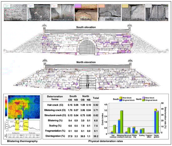 The stone block foundation of the Sungnyemun Gate exhibits physical damage, mainly cracks, blistering, scaling, granular disintegration, fragmentation, and bullet traces by a gunfight. As depicted in the physical deterioration map in Figure 3, the frequency of cracks on the north face was approximately three times that observed on the south face. The cracks are concentrated in the original blocks and can be divided into hair, blistering, and structural cracks. Further, the crack index proposed by Jo and Lee [39] was calculated. The hair crack index was 0.16 on the south face and 1.09 on the north face, the blistering crack index was 1.76 on the south face and 3.06 on the north face, and the structural crack index was 0.15 on the south face and 0.75 on the north face. The blistering cracks showed the most damage. There was less crack damage on the south face, where a higher number of original blocks was replaced with new blocks as compared to the north face.
