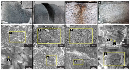 The black crusts comprise carbon materials (13.0 wt.%), which exhibit craquelures that completely cover the original rock as well as gypsum crystals (25.9 wt.% calcium and 22.3 wt.% sulfur) (Figure 4a). The discoloration due to rust from the iron plates is a combination of amorphous iron oxide (33.6–37.9 wt.%), carbon (2.9–16.7 wt.%), and a clay mineral (Figure 4b). The efflorescence contaminants include gypsum crystals (20.2–39.8 wt.% calcium and 17.4–26.8 wt.% sulfur). The crystals are scattered in clusters on the surface, most of which are observed to grow between the cleavage planes of biotite (Figure 4c).