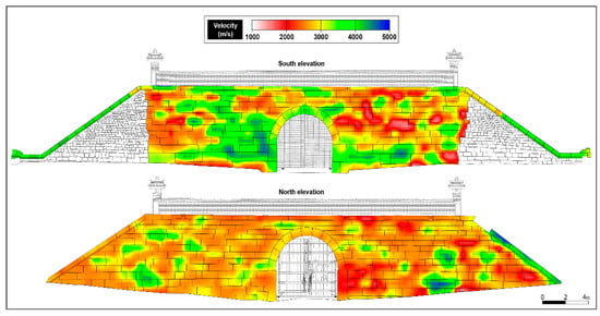 The ultrasonic velocities were projected onto the south and north elevations to examine the overall weathering trend (Figure 6). As a result, the constituent stone materials of the stone block foundation manifested different physical properties based on the original and new blocks. In particular, some blocks on the south and north faces exhibited an extremely low ultrasonic velocity of lower than 1000 m/s; the low ultrasonic velocity zone was concentrated on the lowest part of the south face.