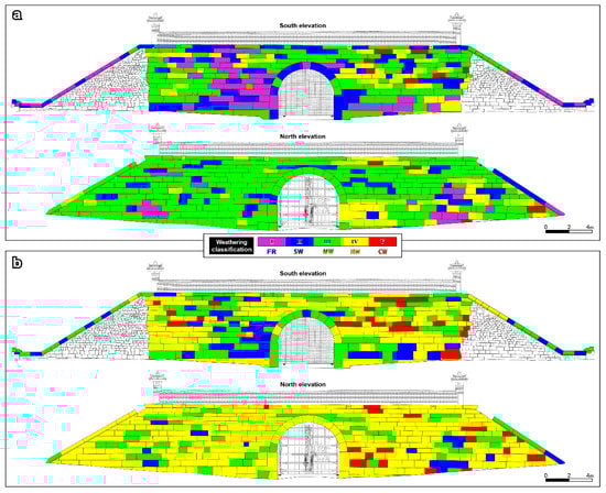 The relative weathering coefficient of the stone materials for each face were calculated based on the ultrasonic velocity of the fresh pink feldspar granite and leucogranite at the provenance site of the stone block foundation of the Sungnyemun Gate (Figure 7). The weathering of the new and original blocks in both the south and north faces is clearly different. Overall, the south face, which has more new blocks than the north face, exhibits diverse weathering characteristics, from the fresh stage to the completely weathered stage.
