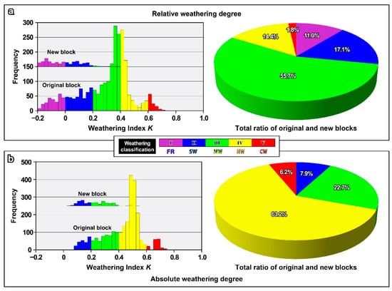 Histograms and pie diagrams of weathering classification in original and new blocks. (a) Relative weathering degree. (b) Absolute weathering degree.