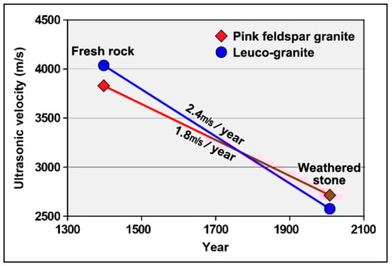 The annual change in ultrasonic velocity was calculated as a linear function by dividing the difference between the ultrasonic velocities of fresh and weathered rocks by the weathering time. The result exhibited that the ultrasonic velocities of pink feldspar granite and leucogranite decreased annually by approximately 1.8 and 2.4 m/s, respectively (Figure 10). Thus, the annual change in the ultrasonic velocity of leucogranite is higher. By considering that intentional damage was caused to the original blocks in 1950 during the Korean War, this change in velocity was not attributed only to natural weathering. If this result is compared with that for stone structures without intentional damage, a relative comparison of weathering characteristics may be possible.