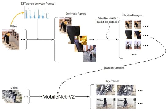 Keyframe extraction has become a hotspot in video processing technology nowadays and mainly uses clustering strategies, such as K-means clustering [19], mean-Shift clustering, density clustering [20], fuzzy C-mean clustering [21], etc. to generate video summaries and retrieve information. Generally, in the field of video retrieval, the video is usually transformed into keyframes so as to improve the efficiency. Sze et al. [22] proposed a keyframe extraction algorithm based on pixel features, which improved the retrieval performance compared with the traditional algorithm based on histogram feature. Pan et al. [21] proposed a keyframe extraction algorithm based on improved fuzzy C-means clustering, extracting frame images from each class as keyframes according to the maximum entropy. Xiao et al. [23] dynamically divided frames into different classes in accordance with the captured content and selected the frame closest to the class center as the keyframe. Wang and Zhu [24] extracted a moving target from the original video as keyframes through lens boundary detection. Chen et al. [25] used posture information to identify and select keyframes with abrupt posture changes on the basis of human targets, in order to make the network have adaptive ability in attitude changes and, thus, extract keyframes having motion information.