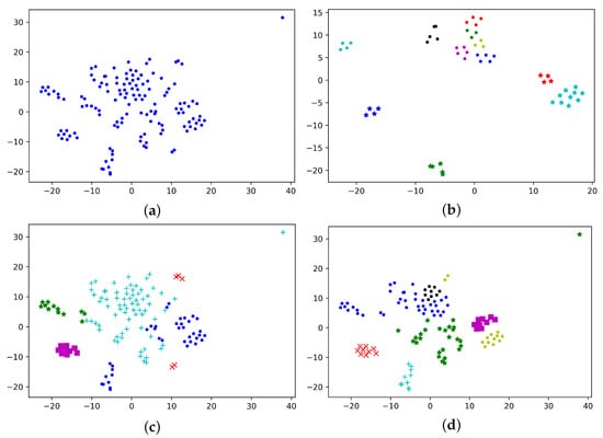 In Formula (8), , . ARI is used to measure the degree of consistency between the two data distributions, and its range is [−1,1]. In order to measure the effect of the clustering algorithm more comprehensively, FMI and AMI are introduced for evaluation through different methods. Their value range is [0,1] and, the larger the value is, the more similar are the clustering results to the ground-truth. FMI and AMI can be expressed by Formulas (9) and (10), respectively.