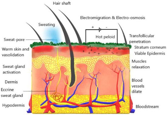 The skin route for peloids’ local therapeutic action or for peloids’ systemic action, provides two routes of penetration, via the pores, sweat glands, sebaceous glands, and hair follicles and via diffusion through the stratum corneum.