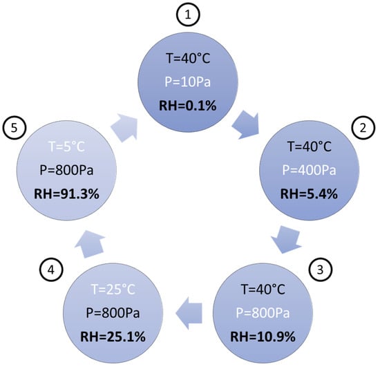 Morphological observation of LiCl-PDMS foam while hydrating was carried out by an environmental scanning electron microscope (ESEM, FEI Quanta 450) operating with an accelerating voltage of 8 kV. Initially, the material was dehydrated in oven at 80 °C for 12 h and then placed in the ESM chamber for acquiring the micrographs under controlled water vapor atmosphere. The relative humidity (RH) was varied between 0 and 90% by tuning the temperature and water vapor pressure in the ranges of 5–40 °C and 10–800 Pa. Specifically, the micrographs were acquired after an equilibration time of 30 min under isothermal conditions (40 °C), varying the water vapor pressure from 10 Pa to 800 Pa (0.1–10.9% of relative humidity), and then under isobaric conditions (800 Pa), varying the chamber temperature from 40 °C to 5 °C (10.9–91.3% of relative humidity). The analysis was concluded, restoring the initial conditions. For clarity, a scheme of the ESEM analysis cycle conditions is shown in Figure 1.