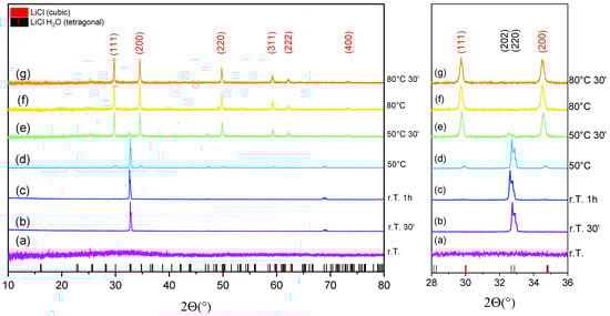 After 30 min under a dry N2 flow, lithium chloride was monohydrated (PDF 04-013-8884) and exhibited a tetragonal structure (P42/nmc; Figure 3 (pattern [b])). After 1 h under the same conditions, the material began to dehydrate (Figure 3 (pattern [c])) and the cubic (Fm-3m) anhydrous phase (PDF 00-004-0664) was present in ~3.7% of the material fraction, as calculated from the Rietveld refinement. As the temperature increased to 50 °C, the most intense reflections indicative of the cubic structure (indexed (111) and (200)) began to be more clearly distinguishable (Figure 3 (pattern [d])), while the ones indicative of the tetragonal structure (indexed (202) and (220)) significantly decreased in intensity. From the phase fraction evolution in Table 1, it is clear that most of the dehydration reaction occurs during the isothermal holding step at 50 °C (Figure 3 (pattern [e])). Indeed, after reaching this temperature, the fraction of the anhydrous phase increased by about 60%. At 80 °C, the material was fully dehydrated (Figure 3 (pattern [f])), and a slight increase in the lattice parameters was observed after the isothermal hold at 80 °C for 30 min (Figure 3 (pattern [g]), Table 1). As lithium chloride transformed from monohydrate to anhydrous, it underwent a significant volume contraction, reduced by ~70% of its initial volume.