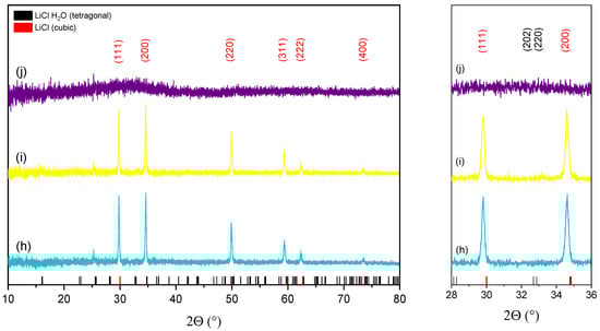 After the complete dehydration reaction, the temperature in the XRD chamber was decreased to r.T. and the collected XRD pattern is reported in Figure 4. The analysis after cooling at r.T. (Figure 4, patterns (h) and (i)) showed the persistence of the anhydrous phase obviously due to the lack of humidity in the chamber. In order to rehydrate the material, the LiCl-PDMS foam was exposed to air at r.T. for 1 h. The collected XRD pattern (Figure 4, pattern (j)) showed a completely amorphous structure due to the overhydration of the LiCl salt. This, as expected, is indicative of the complete reaction reversibility.