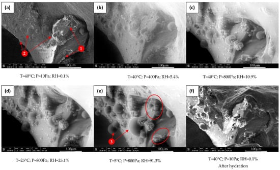 By increasing the RH to 5.4%, no visible morphological modifications could be detected (Figure 6b). Nevertheless, at such an RH value, the beginning of the hydration was expected from the hydration profile, with a water mass uptake of ~17 wt.%. As the RH increased to 10.9%, the hydration reaction was more promoted and the bubbles began to swell (Figure 6c), and their volume increased as the RH increased clearly due to the progressive acquisition of more water molecules (Figure 6d,e), in agreement with the DVS analysis.