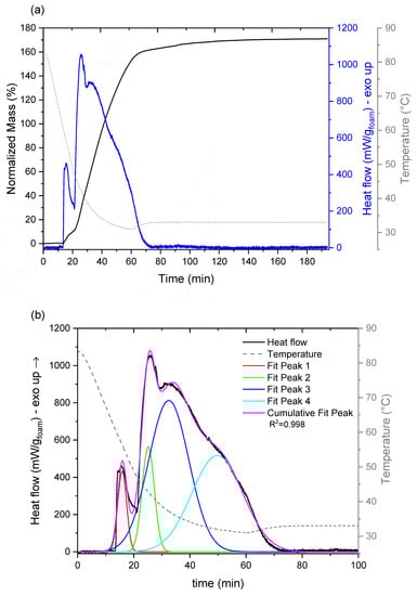 To estimate the foam energy storage/release density, the heat release while hydrating was measured with a coupled TG/DSC analysis under pure water vapor atmosphere to simulate the typical operation of a TES system working with a closed cycle. The TG/DSC profile of LiCl-PDMS foam under the temperature drop of 80–35 °C at 12 mbar of water vapor pressure (10 °C of evaporation temperature) is shown in Figure 7a. The material began to uptake water at ~60 °C, reaching a plateau at 35 °C, that is, under 12 mbar of water vapor pressure, it corresponded to an RH of ~22%. Under this condition, the total percentage of the normalized mass gain was ~170%, corresponding to ~4 water molecules, which is in good agreement with the DVS analysis (see Figure 5). Hence, the material was overhydrated. From the integration of the heat flow profile, the LiCl-PDMS foam energy density associated with this water uptake was estimated to be ~1854 kJ/kgfoam (or ~323 kWh/m3). From the deconvolution of the heat flow signal, as shown in Figure 7b, it is evident that four thermal events (exothermic) occurred while the material hydrated. The mass uptake related to the first peak (~40%) is very close to the one occurring when LiCl converted into its monohydrated phase (42.39%), while the second one began at a temperature of 45 °C, that is, under 12 mbar of water vapor pressure, it corresponded to an RH of 12.5%, very close to the value at which a saturated solution of lithium chloride will form an equilibrium (12.4%). Similarly to the DVS analysis, the remaining two peaks could be associated with the water intake over the monohydrated threshold, which can likely be caused by the capillary condensation mechanism in the foam.