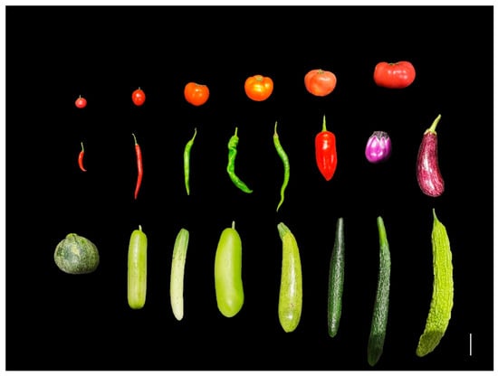 The diversity of plant fruit morphology is related to the adaptation to environmental changes during evolution. In the case of vegetables, fruits can be divided into dry dehiscent and fleshy fruits [1]. Dry dehiscent fruits are mainly distributed in Cruciferae crops, whereas fleshy fruits are found in Solanaceae, Cucurbitaceae, and Asteraceae. Predictive reports about the evolution of angiosperms indicate that fleshy fruits begin with silique, and their genetic regulation network is highly conserved [1,2]. Similar to the different kinds of fruits, the edible parts are also diverse. In the case of Cruciferae, most people feed on edible leaves, whereas in Asteraceae, mainly roots or tubers are consumed. However, in certain vegetable crops, the fruit is not only used for consumption but also cultivated and used to spread seeds. Solanaceae and Cucurbitaceae fruits are large, delicious, and rich in nutritional value. Therefore, the edible part in these families is often the fruit part that can carry seeds. Fruits have evolved into different shapes to adapt to various forms of seed dispersal. In addition, human domestication has promoted the formation of fruit diversity, which has led to a variety of fruit shapes among the same species [3,4,5] (Figure 1). Humans select large fruits in fleshy fruit domestication. The fruit length (FL) of domesticated squash deviated from the original round shape, resulting in flat scallop and long crookneck shapes [6]. Through elongation and flattening, fruits change shape from having similar lengths and widths to dimensions greater or less than 1:1 [7]. Although fruit morphology presents a diversified distribution, the related mechanism research has not been fully explored. This review mainly summarizes the developmental process of fruit shape in vegetables. Understanding the diversity of vegetable fruit morphology and their molecular regulatory mechanism will provide a basis for molecular biology research on vegetable fruit shape.