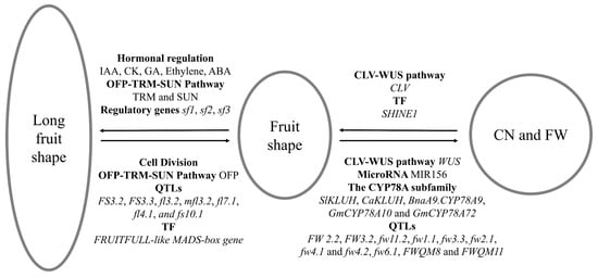 Fruit shape is regulated by several other signaling pathways. These regulation pathways include hormonal regulations, OFP-TRM-SUN pathway, regulatory genes, cell division, QTLs, and TF, which affect the fruit length. The TF, CLV-WUS signaling pathway, MicroRNA, the CYP78A subfamily, and QTLs affect the CN and the FW. These pathways are shown around in red.