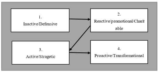 The CE literature also addresses the economic and environmental aspects [14]. Sustainable development objectives (SDGs) such as SDG 12 (sustainable production and consumption patterns) are expected to benefit from the transition to a more circular economy [27]. Several authors have emphasized the necessity of including sustainability in CE business models [2]. However, a circular economy necessitates a thorough understanding of the infrastructure that supports recycling and remanufacturing [27]. Geissdoerfer et al. [3] showed many ways in which sustainability and CE are linked, from conditional to trade-offs. vanTilburg [28] Suggest a simple typology of sustainable business depicted in Figure 1. The authors denote the following designations of a firms’ motivation for sustainability: inactive when sustainability is a burden for the institution; reactive, often a social response focused on reputation; active, utilizing sustainability as a marketing opportunity, or proactive with prioritization of product improvements. Business model innovation is concerned with increasing positive benefits, harnessing opportunities, reducing negative impacts on society and the environment while fostering growth. Thus, innovation fosters external collaboration and changes in the way organizations interact with their networks [29]. Although CE is commonly used to achieve sustainability, the focus is more on the economic and environmental aspects of the equation. Firms must modify how they generate value, comprehend, and conduct business to achieve more sustainability and circularity [3].