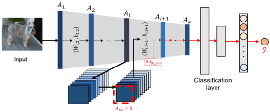 Unit channel suppression on the i-th layer, c-th channel. Activation map of c-th channel had been turned down to zero and passed to consecutive weights to provide (i + 1)-th activation.